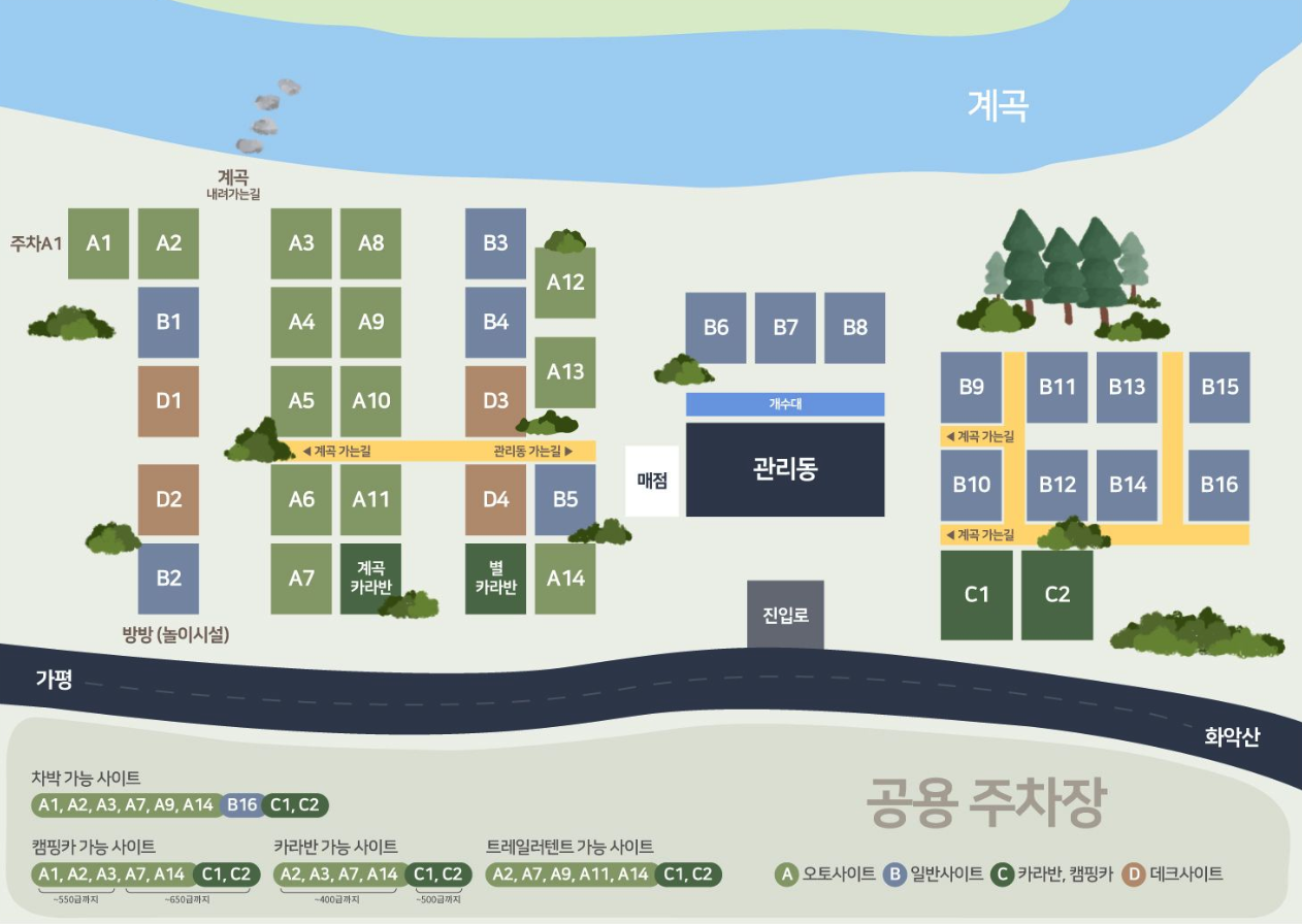 평창별내림계곡캠피앙은 약 2500평+@ 부지에 27개 사이트 (데크 10개, 파쇄석4, 강자갈 13개)를 보유하고 있으며, 16개의 개인샤워실과 공용샤워실, 공용화장실, 냉장고가 준비되어 있습니다.
